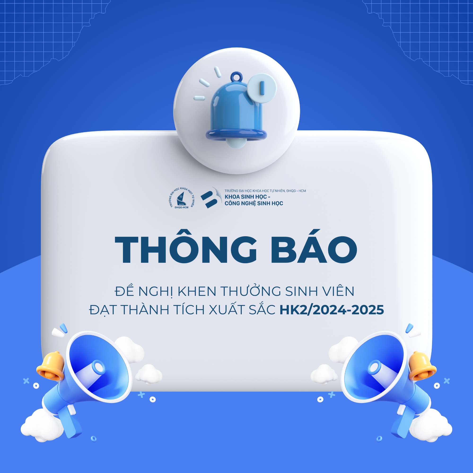 Thực hiện Quy định Công tác khen thưởng, kỷ luật sinh viên theo Quyết định số 2738/QĐ-KHTN ngày 12/12/2023 của Hiệu trưởng Trường ĐH KHTN, phòng Công tác Sinh viên kính đề nghị Quý thầy, cô Ban chủ nhiệm các Khoa lập danh sách đề nghị khen thưởng trong học kỳ 2/2024-2025 cho các tập thể/cá nhân đạt các điều kiện và tiêu chuẩn sau: