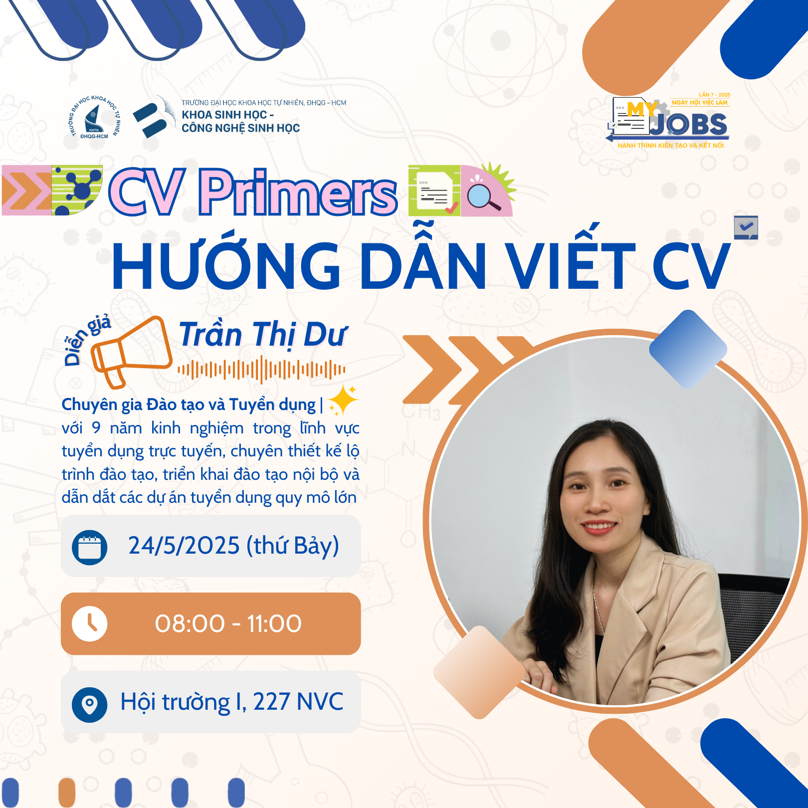 Trong khuôn khổ ngày hội việc làm My Jobs - Lần 7 năm 2025, buổi Workshop CV PRIMER - Hướng dẫn kỹ năng viết CV được tổ chức với mục đích hoàn thiện các kỹ năng liên quan để có thể viết CV một cách hiệu quả, thành công trong việc tạo ấn tượng ban đầu, thể hiện được hình ảnh cá nhân và truyền tải được những thông tin quan trọng của bản thân. Buổi Workshop CV Primer sẽ là bài chia sẻ của chị Trần Thị Dư - Trưởng Phòng Đào tạo tại Công ty Cổ phần JobsGo - với 9 năm kinh nghiệm trong lĩnh vực Đào Tạo và Tuyển dụng thuộc mảng "Tuyển dụng trực tuyến" tại Siêu Việt Group và JobsGo.